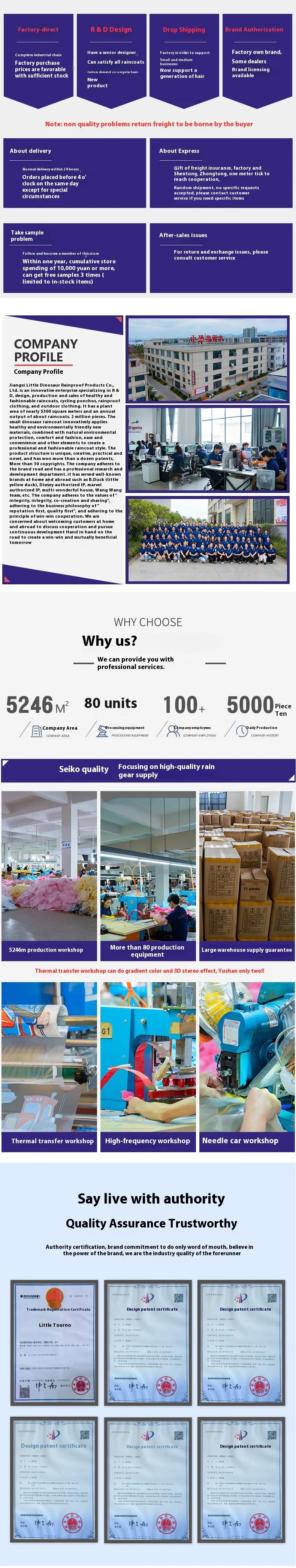 The XIAOKONGLONG raincoat innovatively applies new materials of health and environmental protection, and combines elements such as natural environmental protection, comfort and fashion, ease and convenience to create a professional and fashionable raincoat style. The product structure is unique, creative, practical and novel, and has won more than ten patents and more than thirty edition rights. The company adheres to the brand road, has a professional R & D department, and has served B. duck, Disney, duomiao house, KK tree, PAW Patrol and other well-known brands at home and abroad.