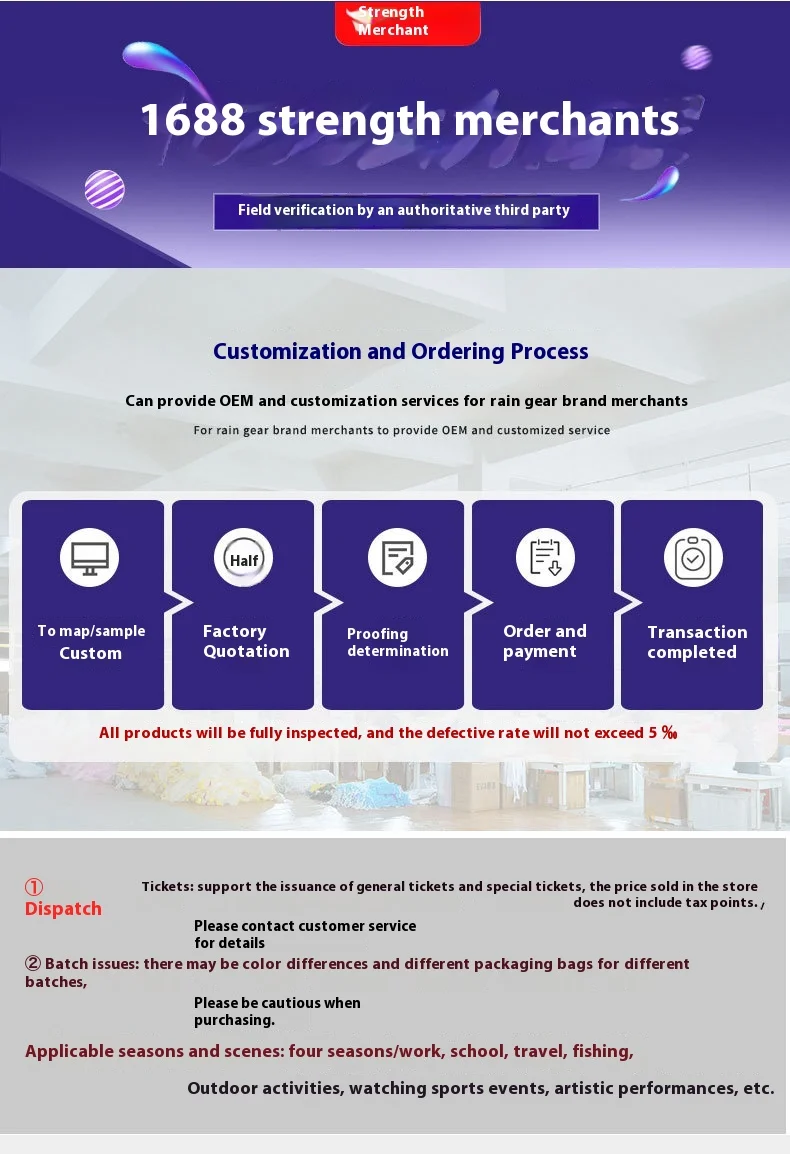Jiangxi XIAOKONGLONG rainproof Products Co., Ltd.Own subsidiaries and brands such as zituoling clothing, xiaokonglong rainproof. is an innovative enterprise specializing in R & D, design, production and sales of healthy and fashionable raincoats, rainproof clothes,ponchos, outdoor clothes,Umbrella end tent. It has a plant area of nearly 10000 square meters and an annual output of about 3 million raincoats.