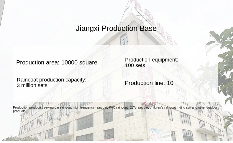 Jiangxi XIAOKONGLONG rainproof Products Co., Ltd.Own subsidiaries and brands such as zituoling clothing, xiaokonglong rainproof. is an innovative enterprise specializing in R & D, design, production and sales of healthy and fashionable raincoats, rainproof clothes,ponchos, outdoor clothes,Umbrella end tent. It has a plant area of nearly 10000 square meters and an annual output of about 3 million raincoats.