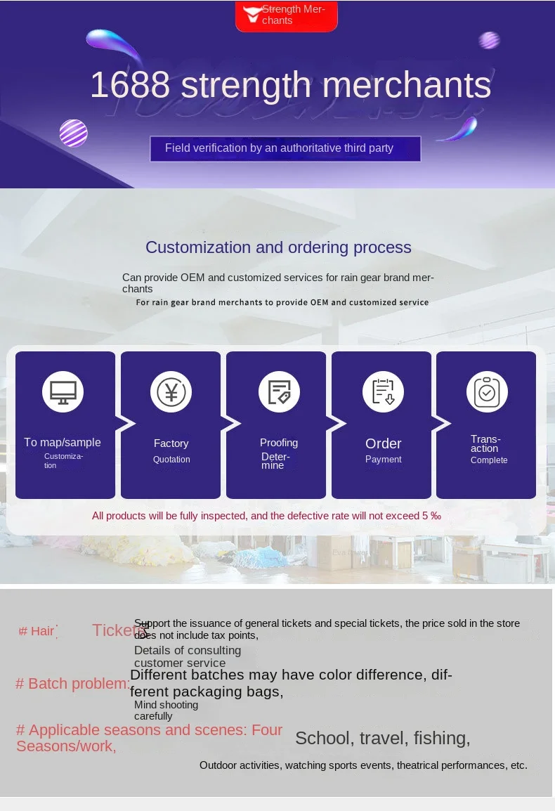 Jiangxi XIAOKONGLONG rainproof Products Co., Ltd.Own subsidiaries and brands such as zituoling clothing, xiaokonglong rainproof. is an innovative enterprise specializing in R & D, design, production and sales of healthy and fashionable raincoats, rainproof clothes,ponchos, outdoor clothes,Umbrella end tent. It has a plant area of nearly 10000 square meters and an annual output of about 3 million raincoats.