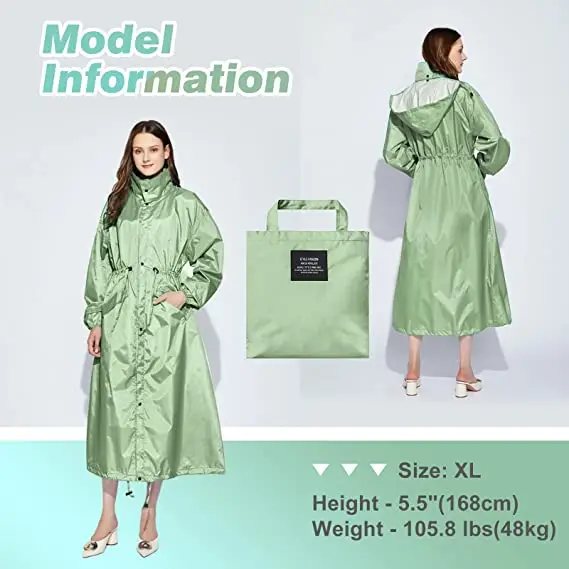 Customized Rain Jacket Women's Windproof Hooded Rain Jacket Green Long, Waterproof,Outdoor Raincoat Poncho With Adjustable Waist