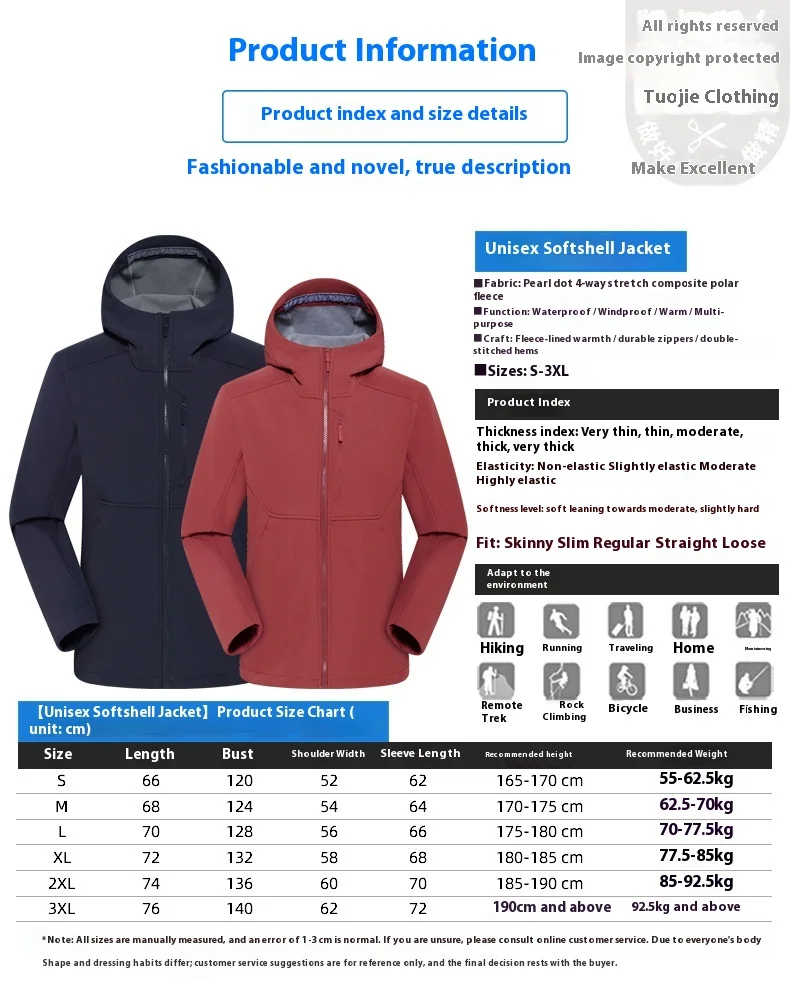 Men's Soft Shell Jacket Waterproof Windproof Autumn Winter Fleece Single Coat for Climbing Women's Mountain Gear