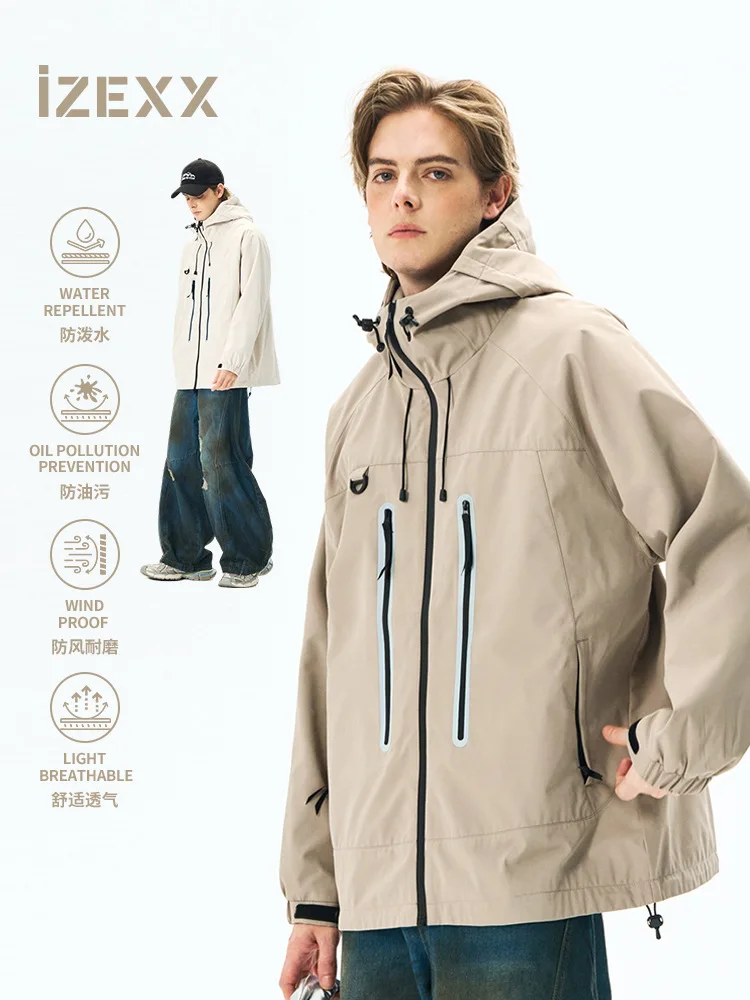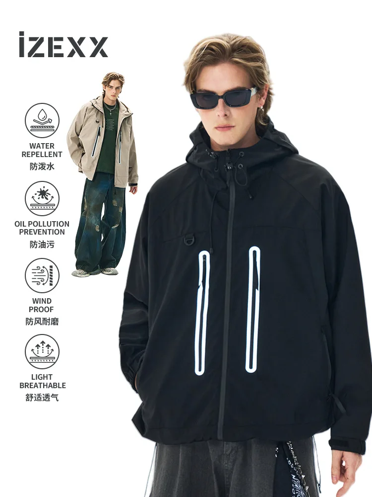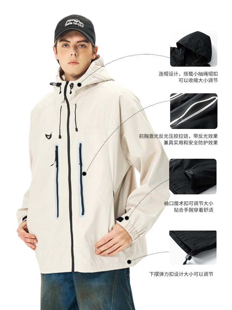 Mountain Outdoor Canvas Reflective Hoodie Jacket Men's Hiking Camping Mountaineering Suit Couple Front Logo Waterproof