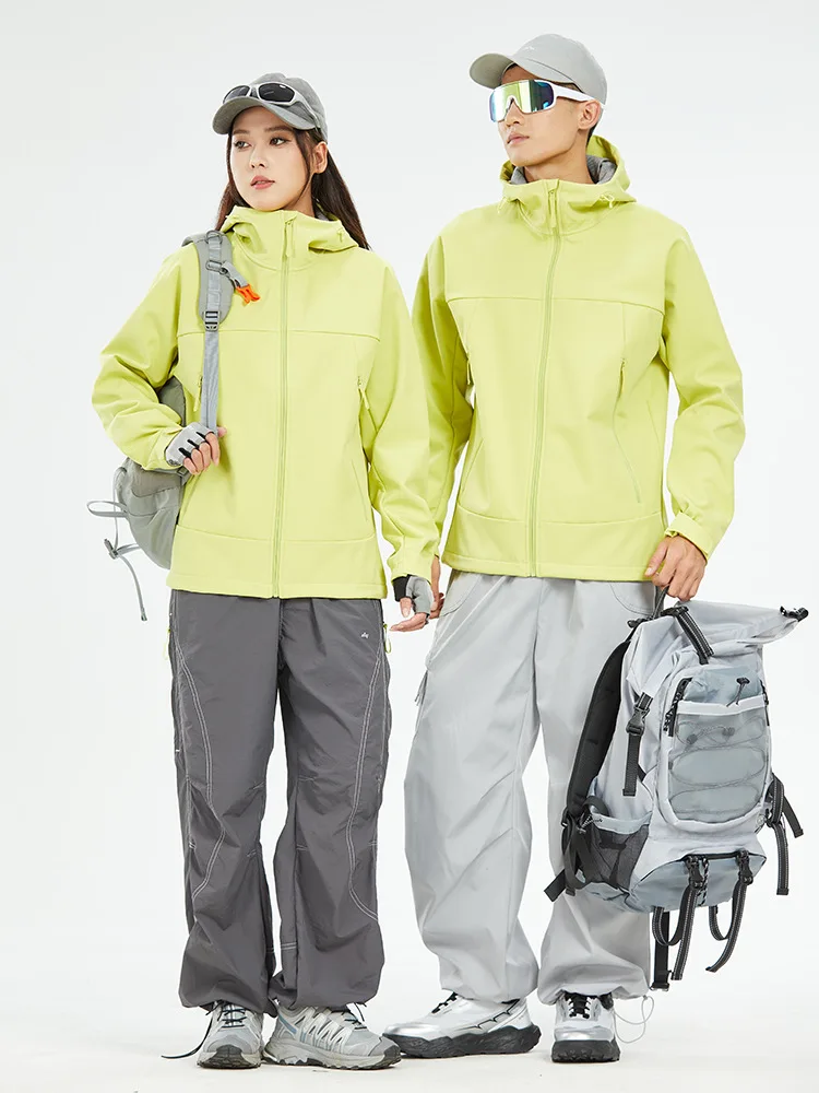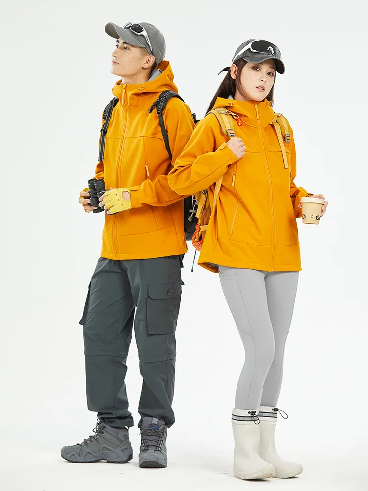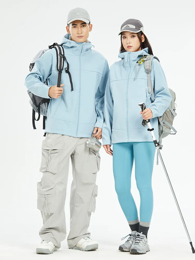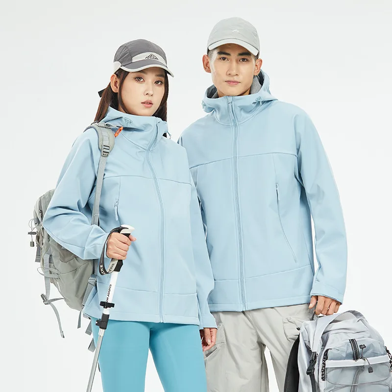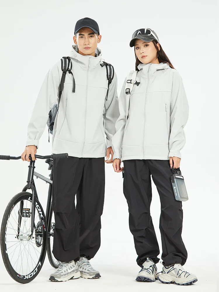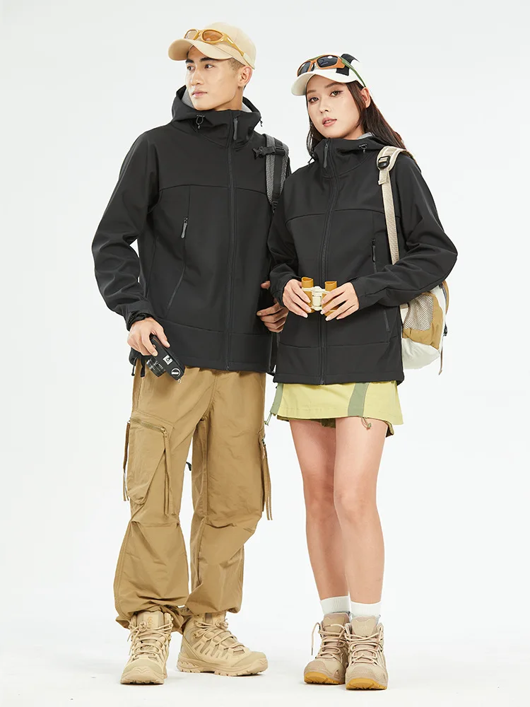 2.Stand Collar and Hooded: The softshell jacket features a stand collar and a hood for added warmth and coverage. The hood is adjustable, so you can customize it to your preferences to provide optimal protection from wind and rain.